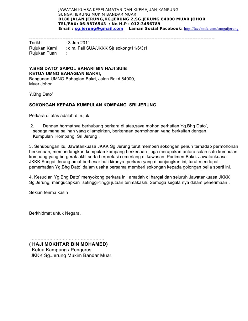 Surat Sokongan Ketua Kampung Contoh Surat Rasmi Sokongan Ketua Kampung Tribomz